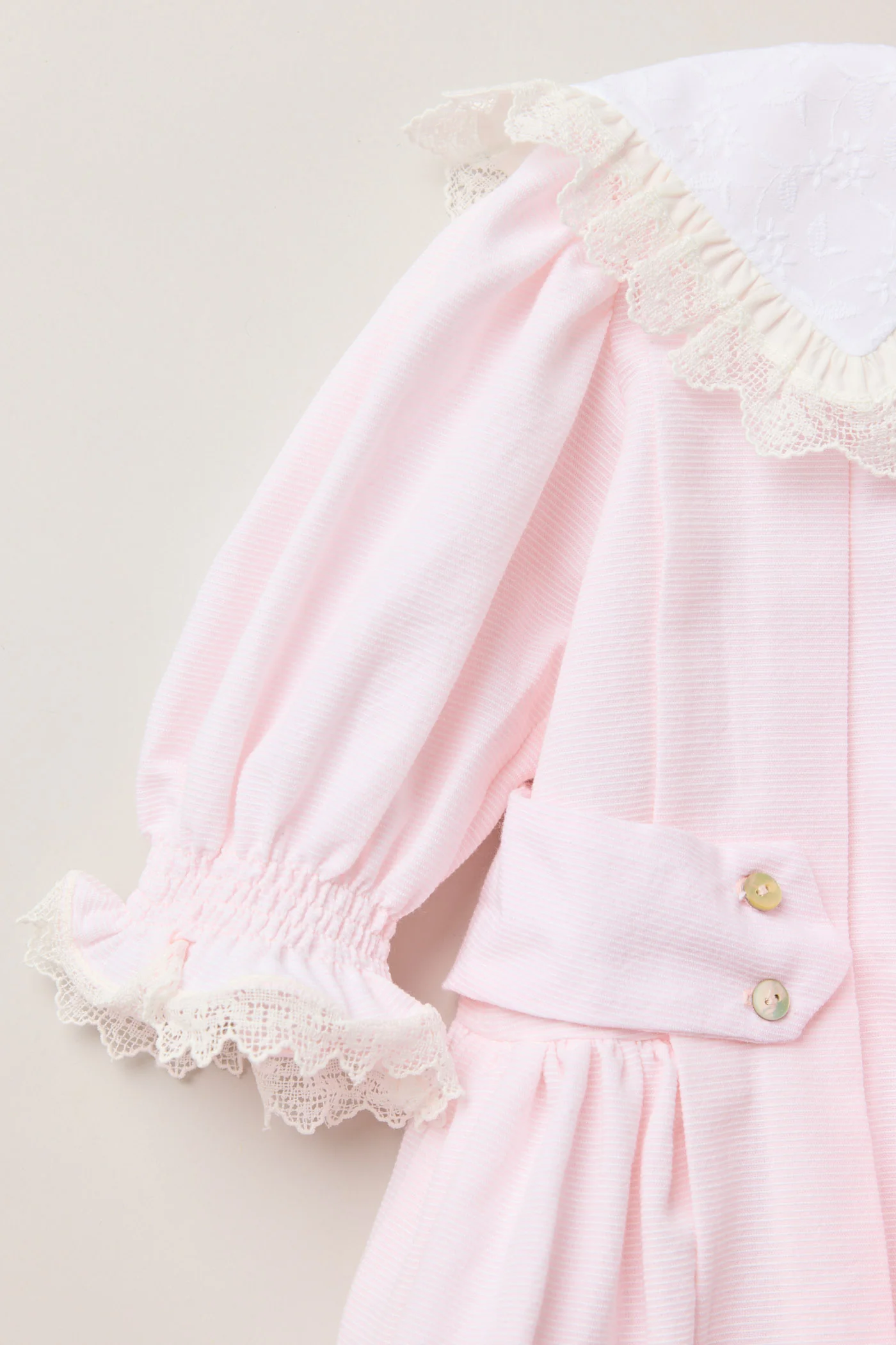 Our Piano dress is truly mesmerizing as we showcase another fine version in a faint light pink. The fabric is hypnotic and ever so sophisticated in our traditional cut. The cotton woven mix is subtle yet ever so chic, each time your little one discovers it she will be thrilled to frolic around giggling, and reliving fond memories each time. Proudly parade in our Victorian-esque dress, angular embroidered lace-trimmed collar in a crisp white. Cuffed sleeves with frilly lace on the edges, impeccable box pleats and detachable side belts. A floral laced motif to add the finishing touch. Customary cotton voile lining and signature mother of pearl buttons.