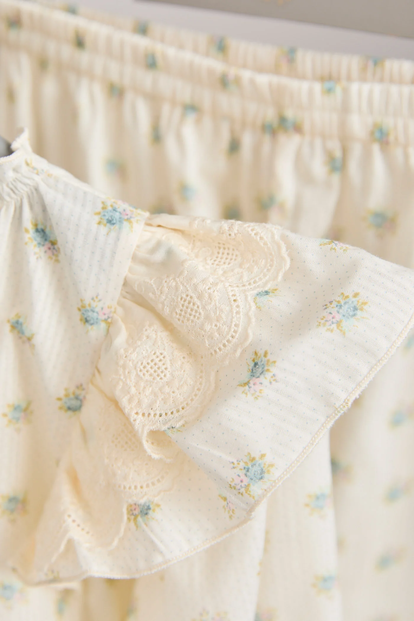 The top features exquisite lace-trimmed ruffles on the shoulders and cuffs, adding a touch of vintage elegance, while the delicate ribbon tie at the neckline enhances its dreamy appeal. The matching trousers, finished with soft lace at the hem, ensure both comfort and refinement, making this night dress for girls as beautiful as it is practical.