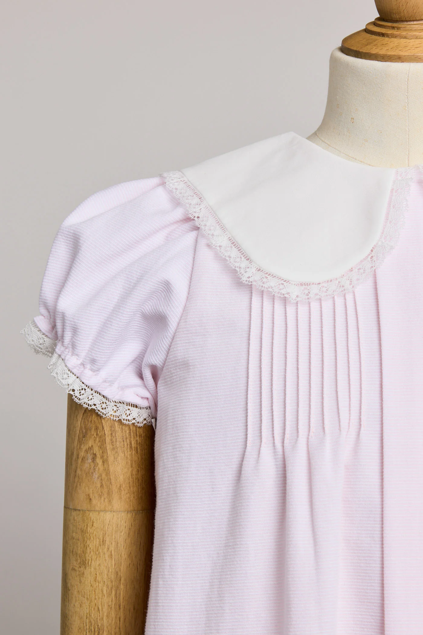 Your little one as she wears her Bubble Dress. See how the puff sleeves give her the perfect cute touch with a lace trim on them. The babydoll collar is finished with delicate lace trim and will frame her adorable face as she wears this for playtime. The bodice of the dress is minimally fitted with little tucks, while the wide skirt is the perfect outfit for all of her pirouettes. The Bubble Dress has two tiny pockets to store all your ballerina's precious treasures and fastens at the back with mother-of-pearl buttons. Lined with a cotton voile.