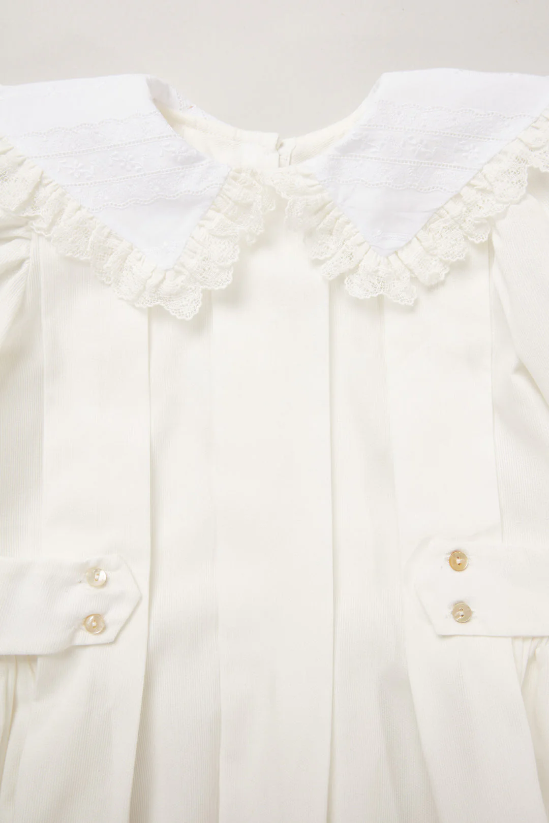 Our timeless Baby Piano White dress never fails to impress as your little one will always be turning heads while observers appreciate this beautiful craftsmanship. Based on an original Victorian frock. Proudly parade in our Victorian-esque dress, angular embroidered lace-trimmed collar in a crisp white. Cuffed sleeves with frilly lace on the edges, impeccable box pleats and detachable side belts. A floral laced motif to add the finishing touch and our signature mother of pearl buttons. Made with passion in London.