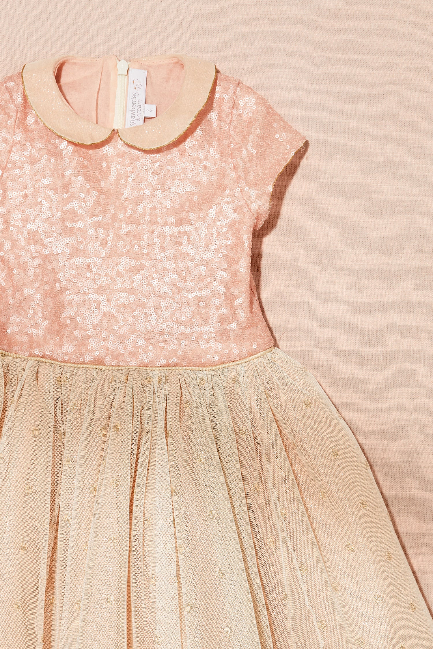 Delicate and magic festive layered party dress with pink matt sequins on top and layered in a cream-coloured tulle. Twirl and dream in this exquisite dress, perfect for a special occasion.