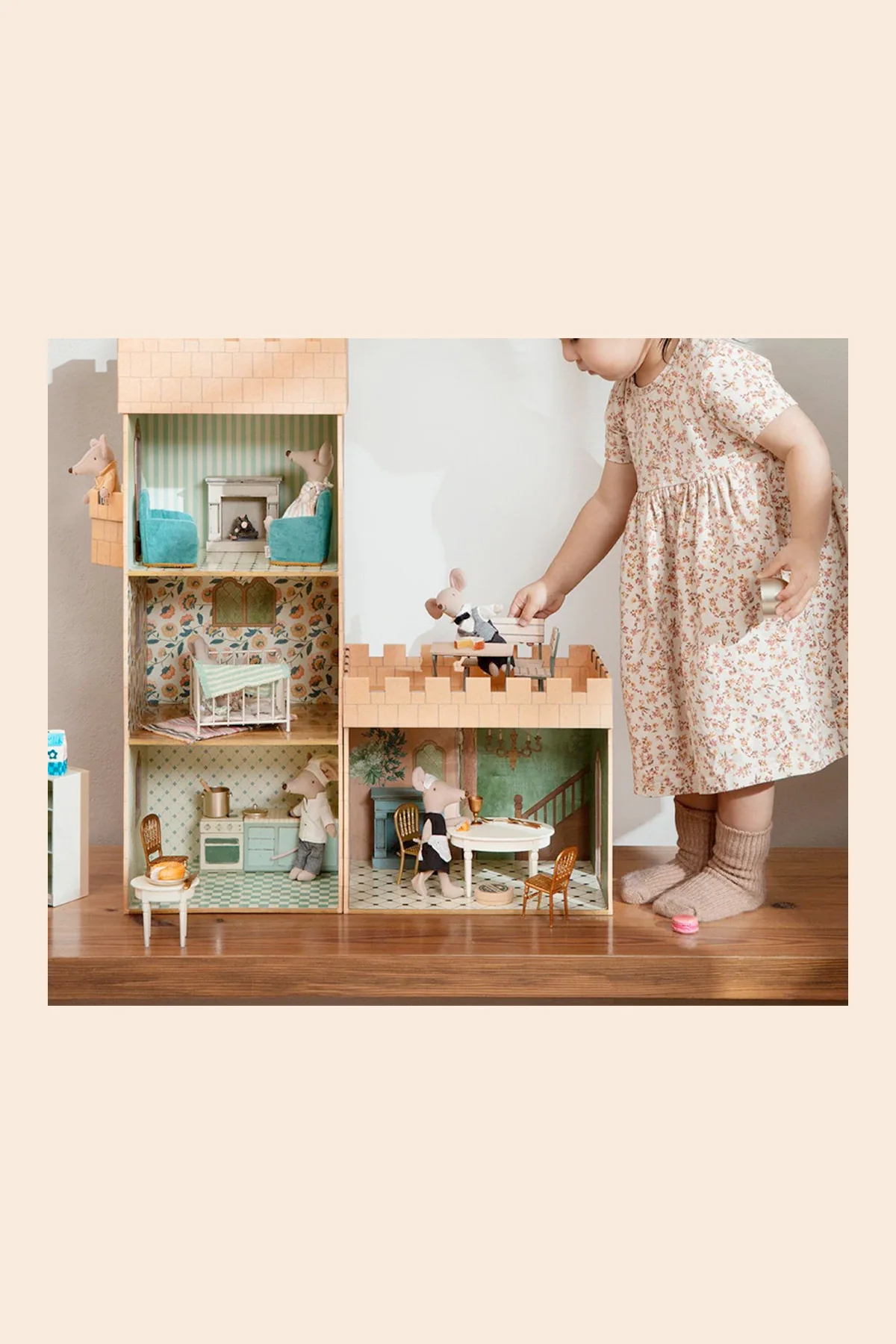 This castle is a beautiful home for all mice. It is made of cardboard covered by unique Maileg prints. Use it as a small home for your mice or as a connecting hall for the two Maileg castles.