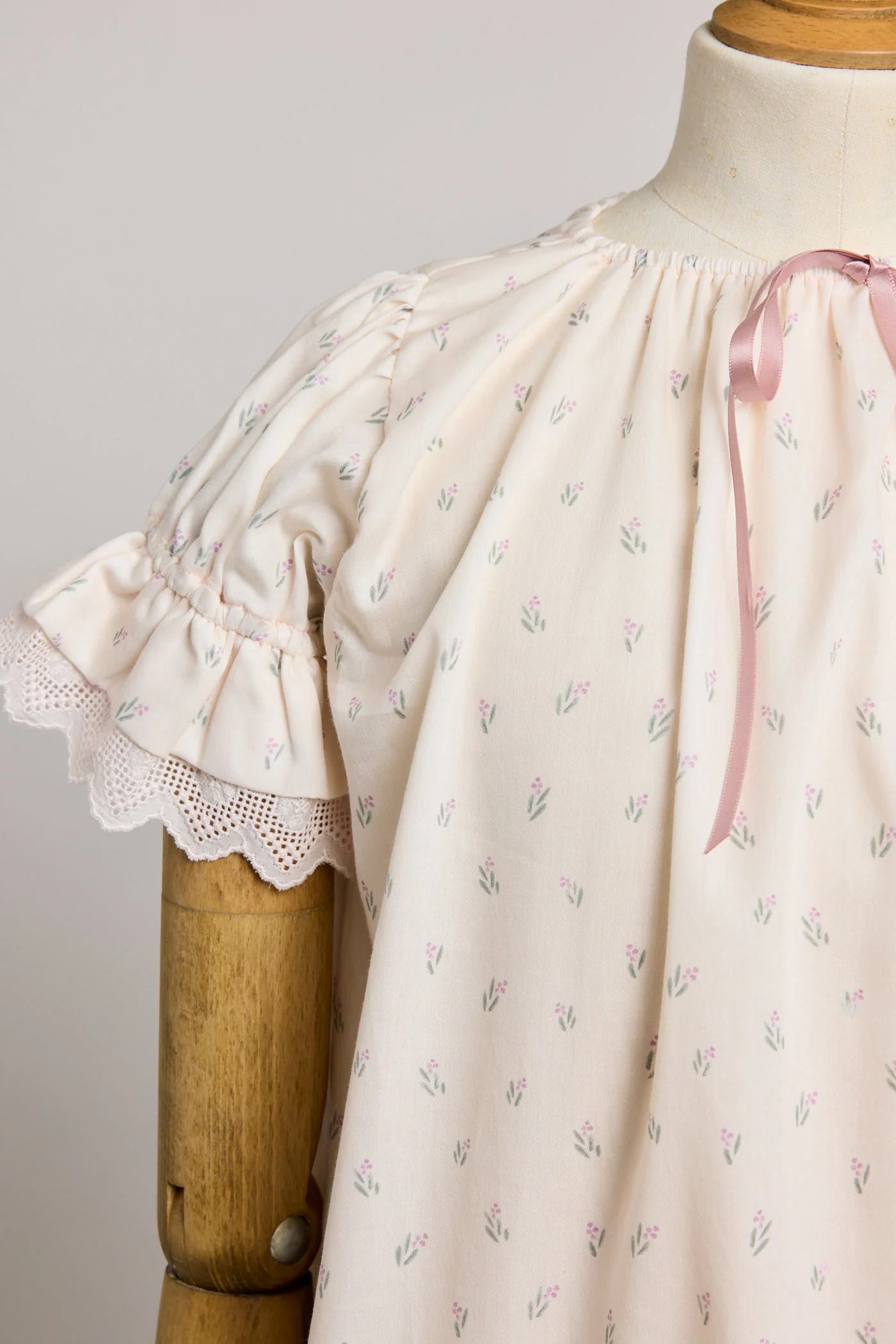 Our Moon Night dress is covered in a delicate print with a sweet ribbon bow on the neckline, cuffs are finished with a lace trim, adding an extra special touch to those pre-bedtime twirls.