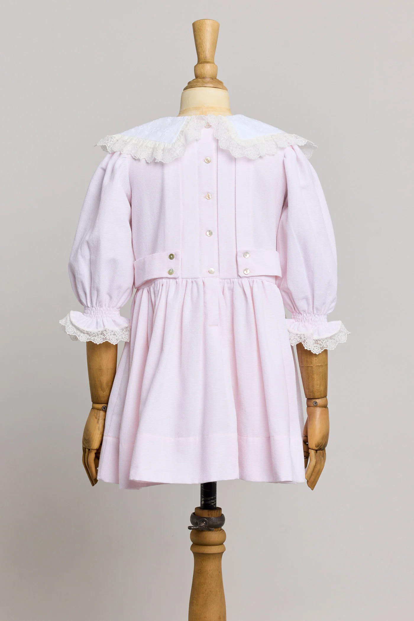 Our Piano dress is truly mesmerizing as we showcase another fine version in a faint light pink. The fabric is hypnotic and ever so sophisticated in our traditional cut. The cotton woven mix is subtle yet ever so chic, each time your little one discovers it she will be thrilled to frolic around giggling, and reliving fond memories each time. Proudly parade in our Victorian-esque dress, angular embroidered lace-trimmed collar in a crisp white. Cuffed sleeves with frilly lace on the edges, impeccable box pleats and detachable side belts. A floral laced motif to add the finishing touch. Customary cotton voile lining and signature mother of pearl buttons.