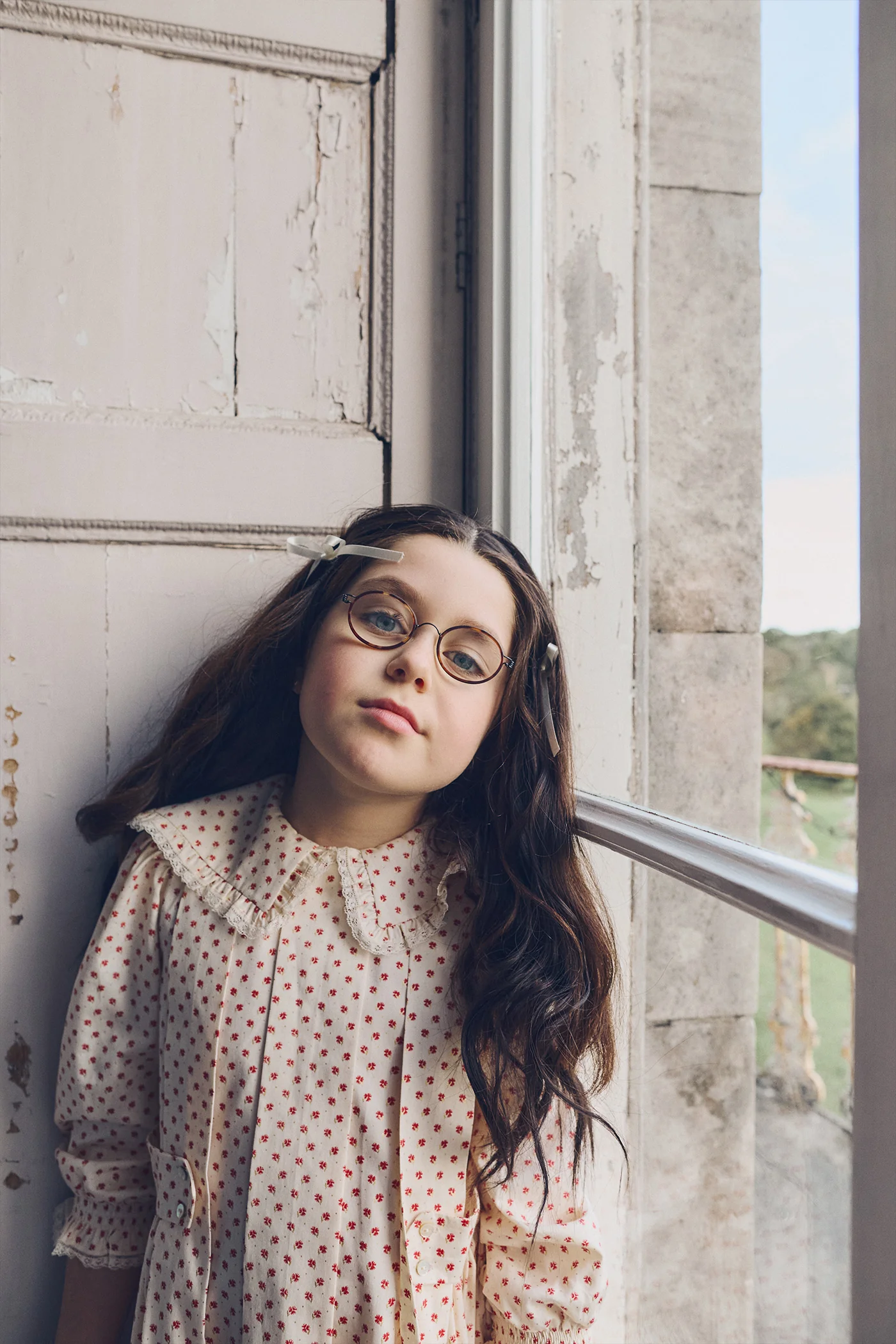 The minuscule metallic stems are shining alongside the golden dotted pattern, echoing pure luxury. Let your little one proudly parade in our Victorian- esque dress with embroidered laced collar and frilly trimmed sleeves. Impeccable box pleats and detachable side belts. Signature iridescent mother of pearl buttons.