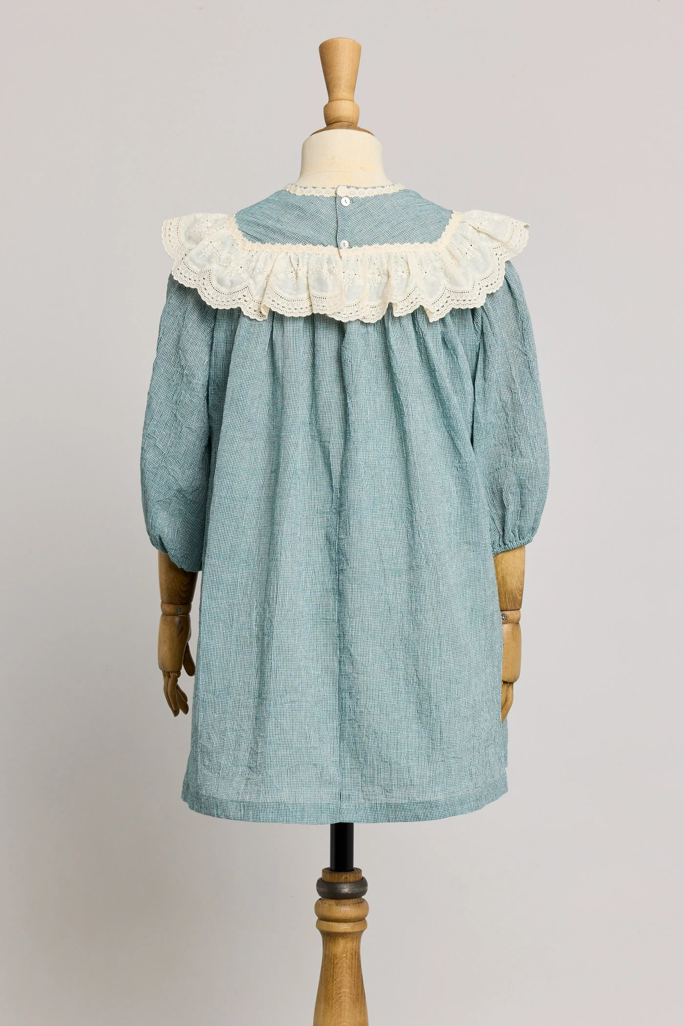 The intricate detailing of the triple tucked pleats at the bodice. Elaborate draping on collar makes a standout statement with the finishing touch of the teal lace trim.