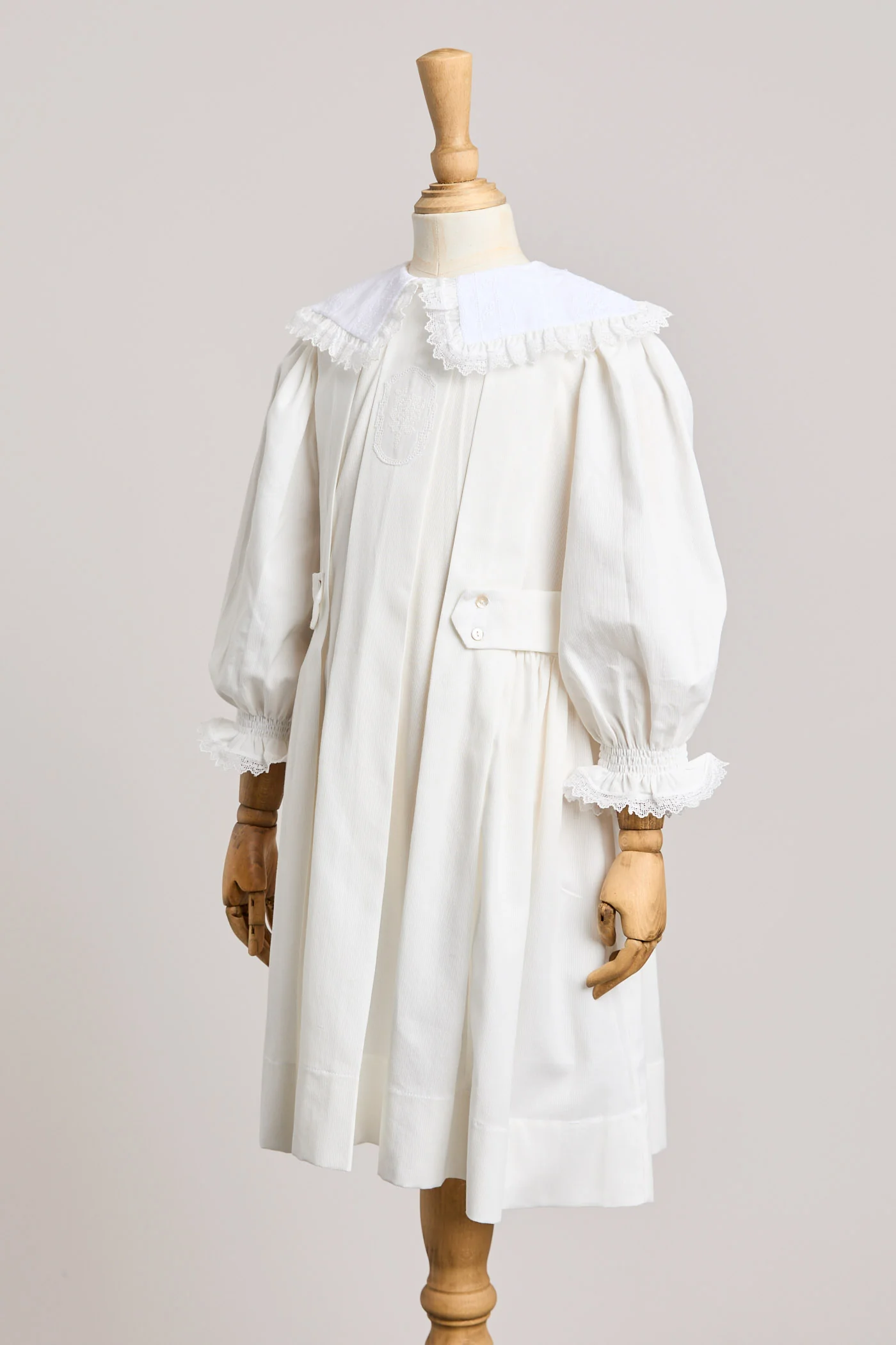 Our timeless Piano White dress never fails to impress as your little one will always be turning heads while observers appreciate this beautiful craftsmanship. Based on an original Victorian frock. Proudly parade in our Victorian-esque dress, angular embroidered lace-trimmed collar in a crisp white. Cuffed sleeves with frilly lace on the edges, impeccable box pleats and detachable side belts. A floral laced motif to add the finishing touch and our signature mother of pearl buttons. Made with passion in London.